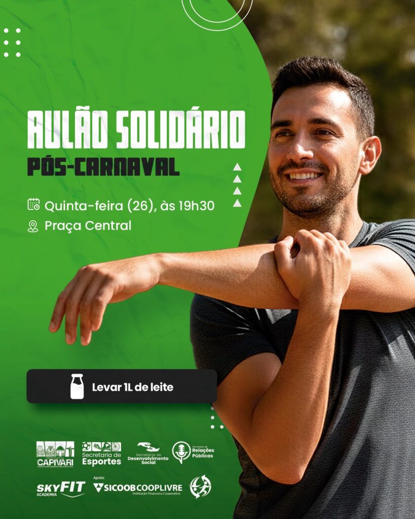 A Secretaria de Esportes, em parceria com a Secretarias de Desenvolvimento Social e de Relações Públicas anunciou nesta semana mais uma novidade para a população de Capivari, envolvendo o público participante do programa “Treino Funcional”, grande sucesso que move multidões em todos os seus encontros. Nesta quinta-feira, 26, acontece o ‘Aulão Solidário de Pós-Carnaval’, visando a arrecadação de um litro de leite por participante que será destinado à instituições de caridade do município. A ação acontecerá na Praça Central da cidade, a partir das 19h30 e é aberto ao público.