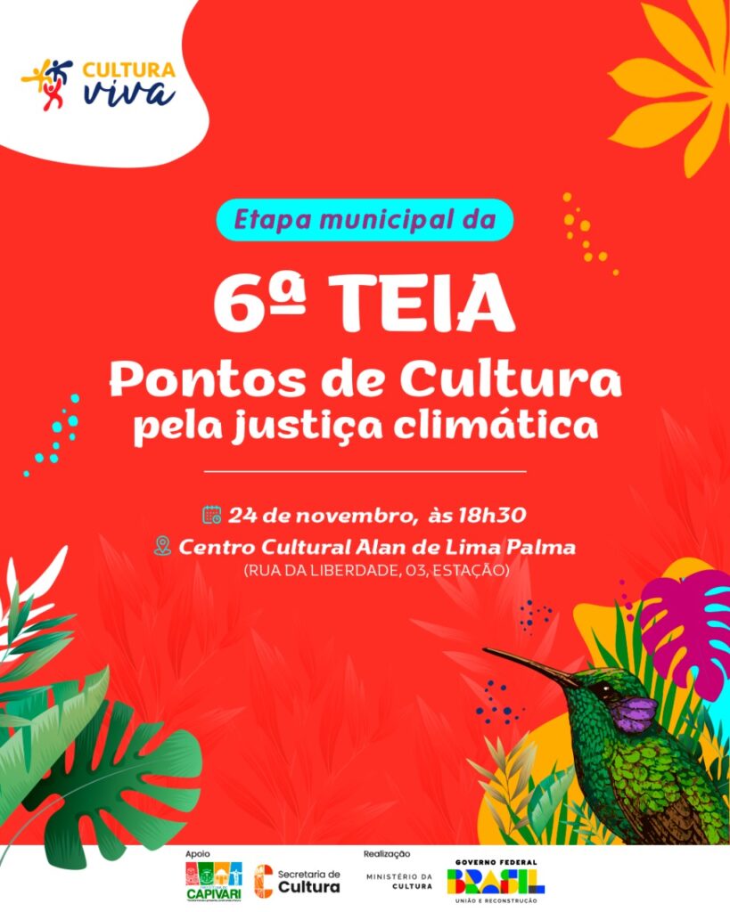No próximo dia 24 de novembro, a Secretaria de Cultura de Capivari realiza a Etapa Municipal da 6ª Teia dos Pontos de Cultura pela Justiça Climática, a partir das 18h30, no Centro Cultural Alan de Lima Palma, localizado na rua da Liberdade, 3, Estação.