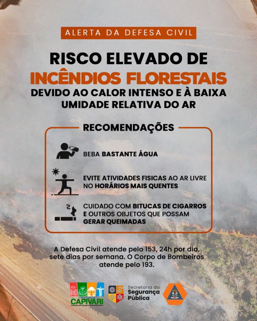 A Defesa Civil do Estado de São Paulo emitiu um novo alerta meteorológico, válido para esta terça-feira (30), informando em situação de emergência para baixa umidade e risco de incêndio em Capivari e outras regiões do estado.
