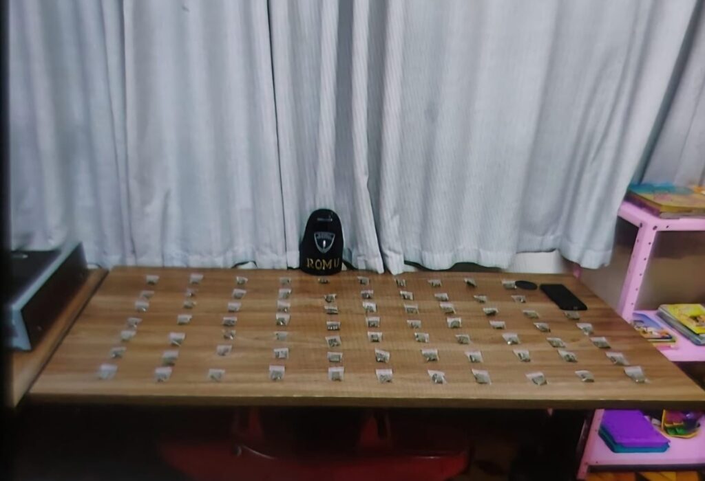 Na busca pessoal, nada de ilícito foi localizado, sendo encontrado apenas um aparelho celular. No entanto, ao verificarem a sacola dispensada, os agentes localizaram 75 porções de maconha.