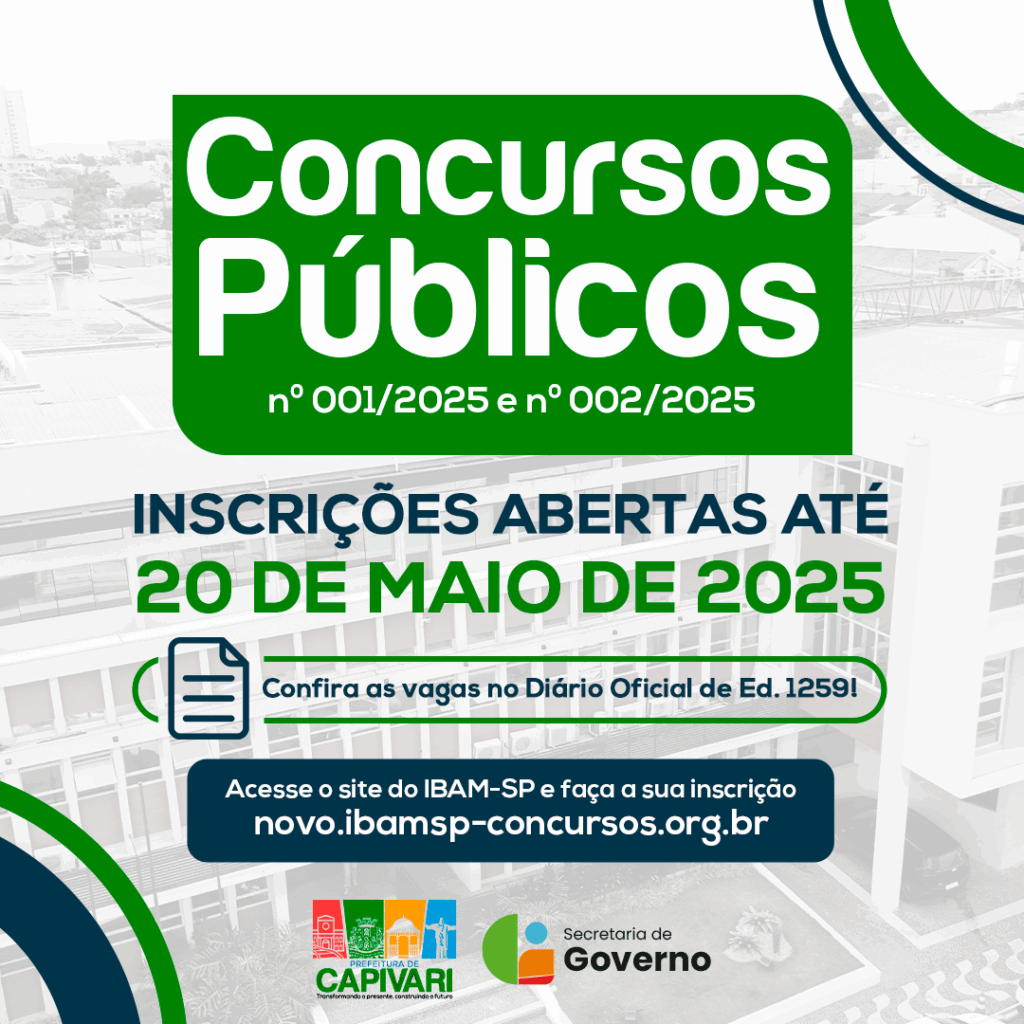 A Prefeitura de Capivari anunciou na última sexta-feira (17) a abertura de dois concursos públicos (01/2025 e 02/2025) visando preencher vagas em áreas diversificadas. Os salários vão de R$ 2.307,31 a R$ 7.109,01 e as inscrições podem ser realizadas até 20 de maio.